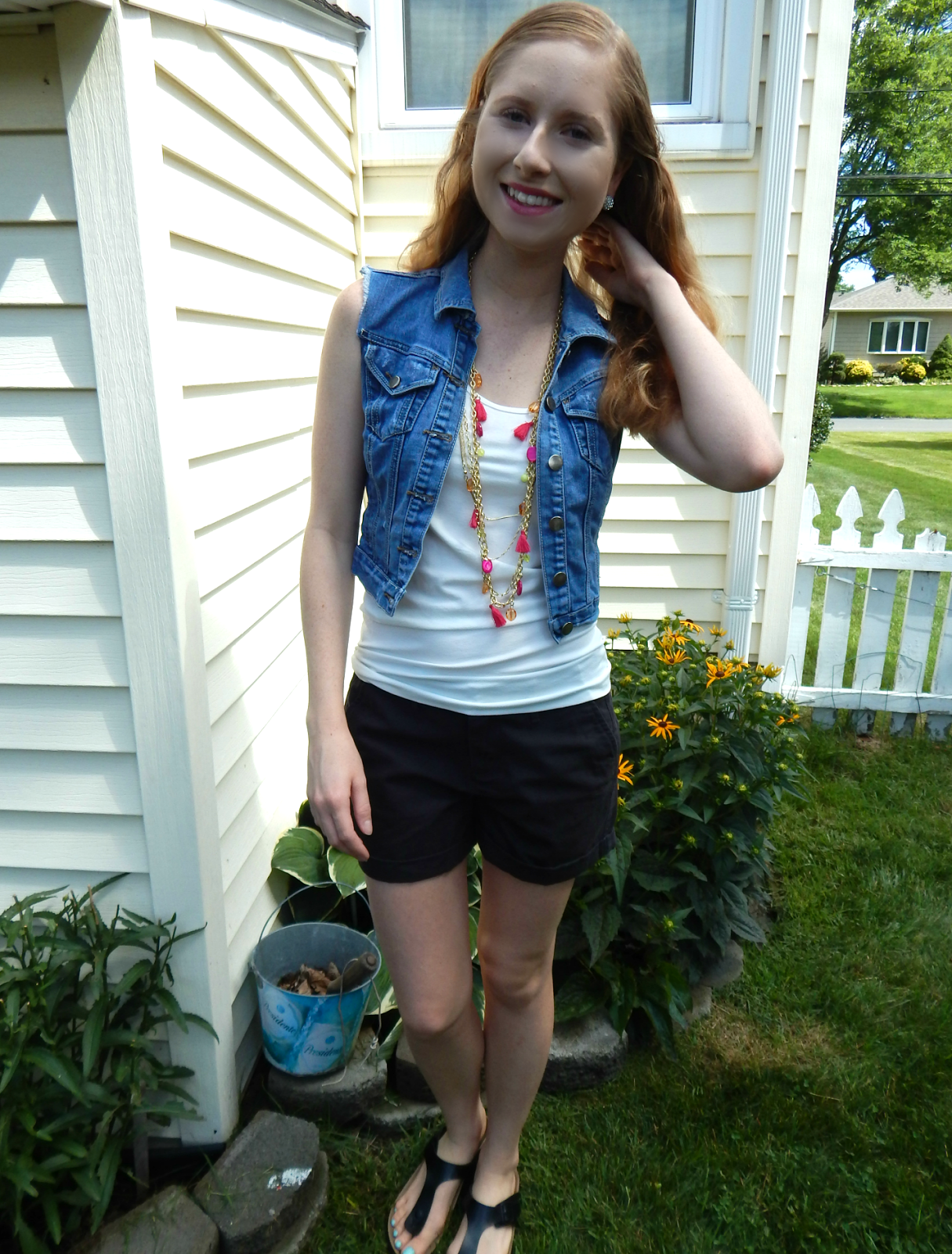 For my first New York look, I wore a white tank top (only $4!) and denim vest (from Target $9) because we were going to visit the Fire Island Lighthouse and the weather was warm but breezy. My clothes were very neutral so I added my favorite inexpensive Charming Charlie tassel necklace (I bought it for $6, but this very similar one is $2.99!). My shorts are boyfriend style, so they are loose and baggy and were only $10 when Old Navy was having a huge sale last week for the 4th of July. Check back for more looks all week!