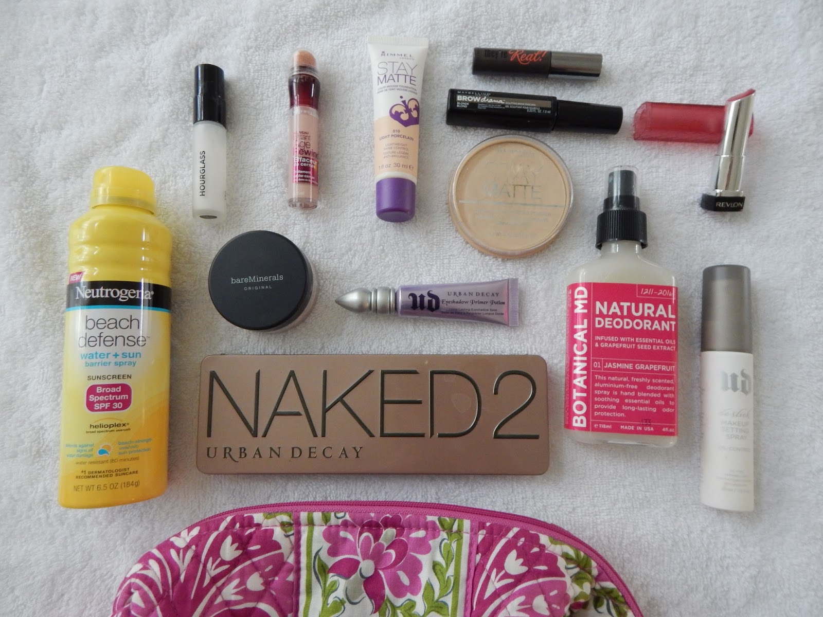 neutrogena sunscreen // hourglass primer {travel size $18} // maybelline age rewind brightener // rimmel stay matte foundation in ‘porcelain’ // ‘they’re real!’ benefit mascara // maybelline browdrama // rimmel stay matte powder // bareminerals foundation in ‘fair’ // urban decay eyeshadow primer // naked 2 eyeshadow palette // botanical md natural deodorant // revlon lip butter ‘raspberry pie’ // urban decay setting spray // vera bradley large cosmetics bag