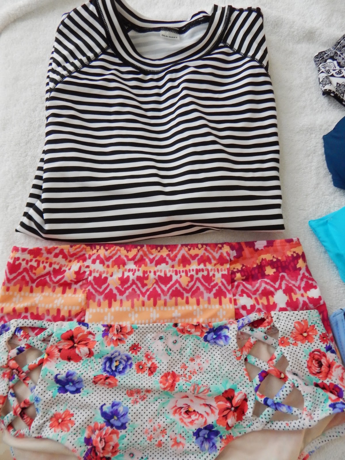 old navy swim shirt // similar {$19.50 asos} black + white bandeau // similar {$19} navy bandeau //similar turquoise bandeau // triangl inspired {$15 asos} bandeau // aerie high-waisted bottoms // cotton on floral bottoms {similar}