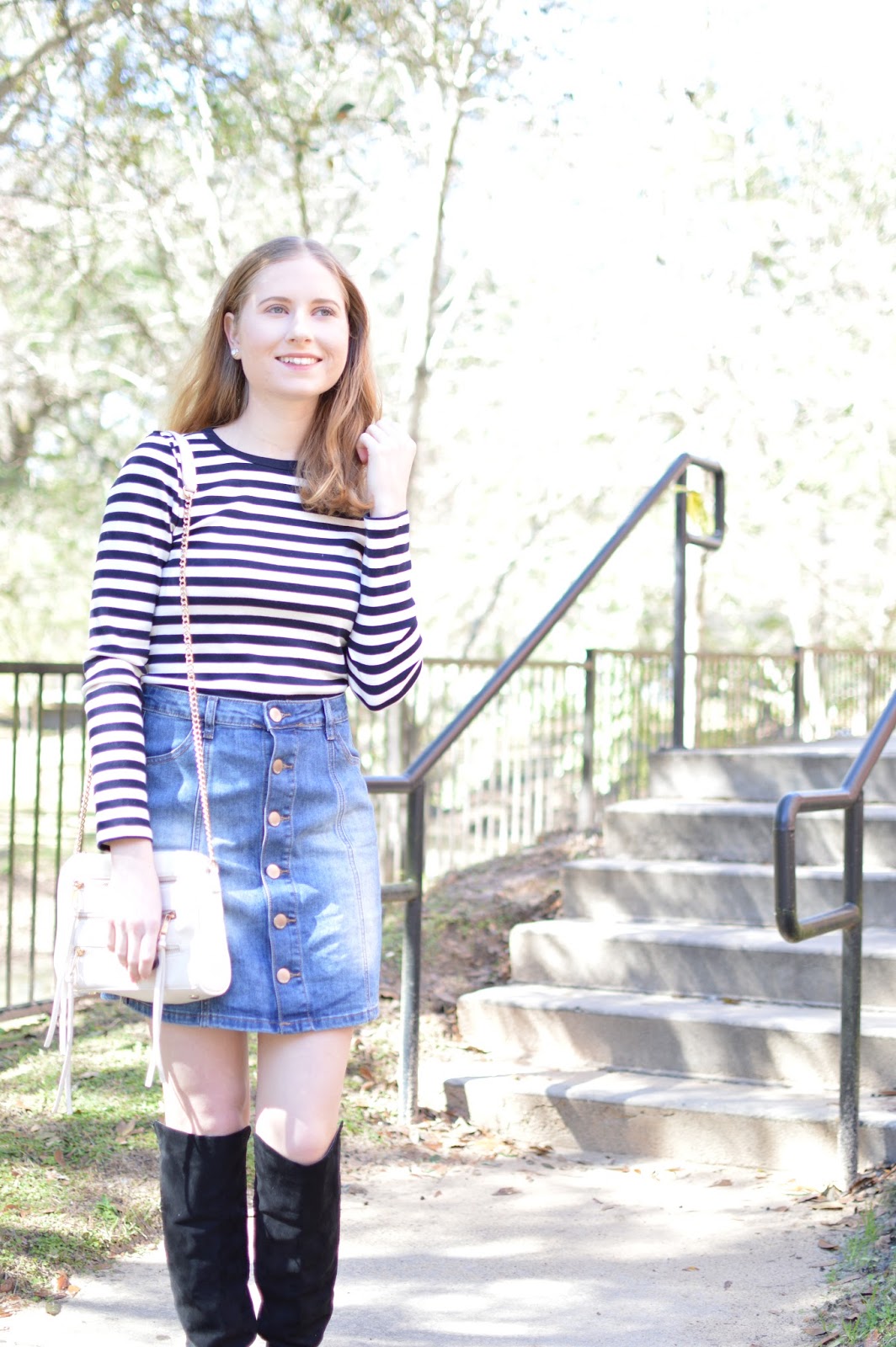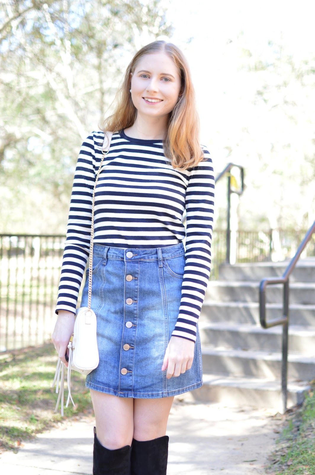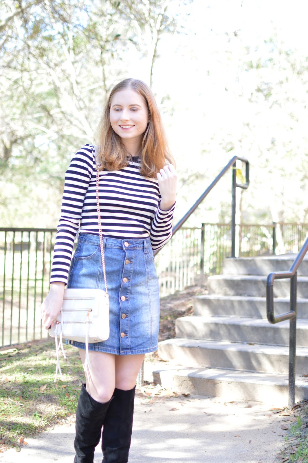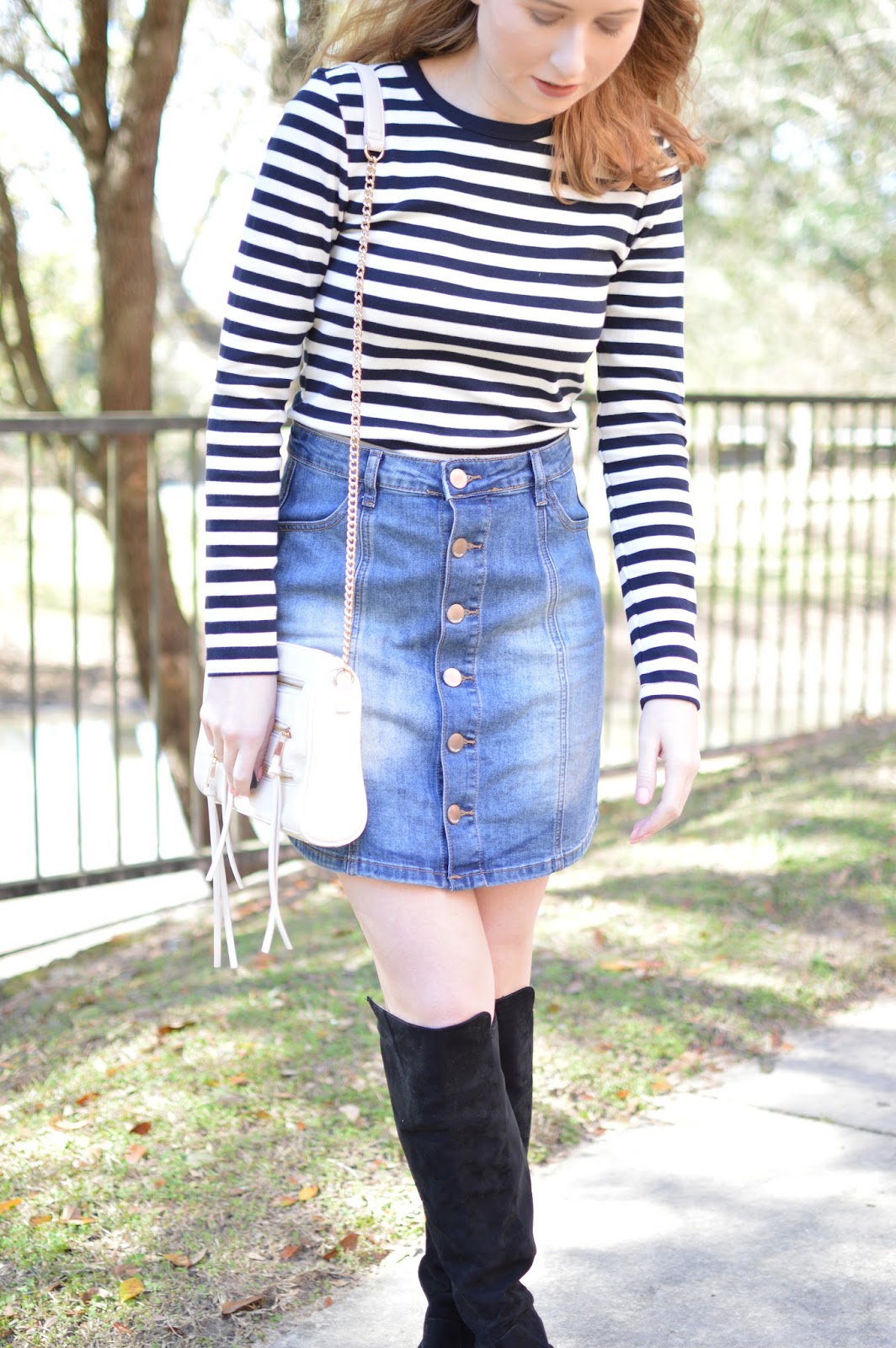 Top: Black and White Striped Long-sleeve Joe Fresh $7 // Skirt: Charlotte Russe Button-up Denim Skirt // Boots: DSW Over-the-knee boots {similar $22 ones!} // Bag: Forever 21 {similar $22.90}