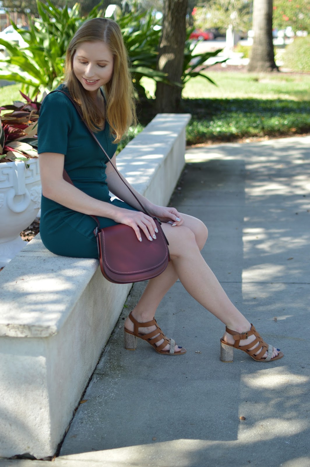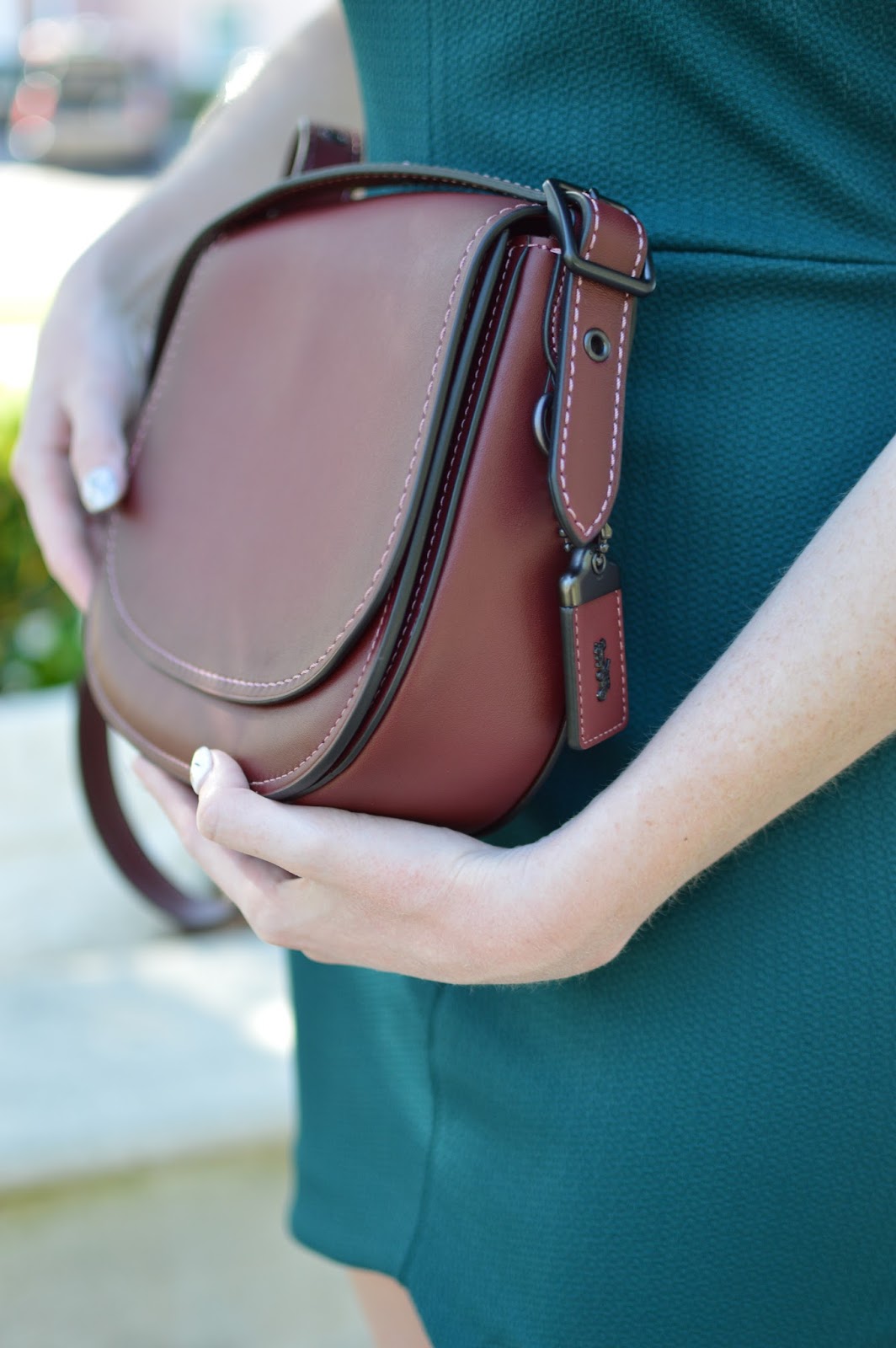 I am also so excited to mention that I am partnering with Coach for today’s look. I’ve loved the Coach brand for years because it happens to be my Mom’s favorite brand, too! When they reached out to me to see if I wanted to style their new saddle bag, I did not hesitate one second to respond to this wonderful opportunity. What I love about this bag is the beautiful exposed stitching–it’s so elegant and unique. The size of this cross-body bag is just right– and it’s surprisingly roomy inside for all my products and wallet! It comes in so many colors, too, but this wine color is just the best. It pairs wonderfully with my green dress that I found similar ones to HERE and HERE as mine is from a thrift store!