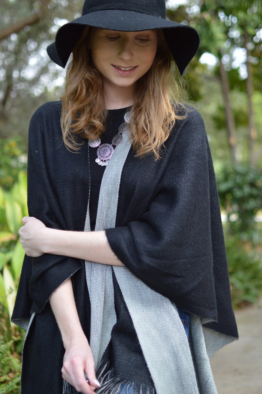 Poncho + Boyfriend Jeans Look