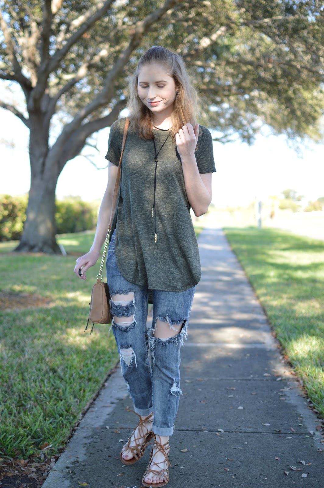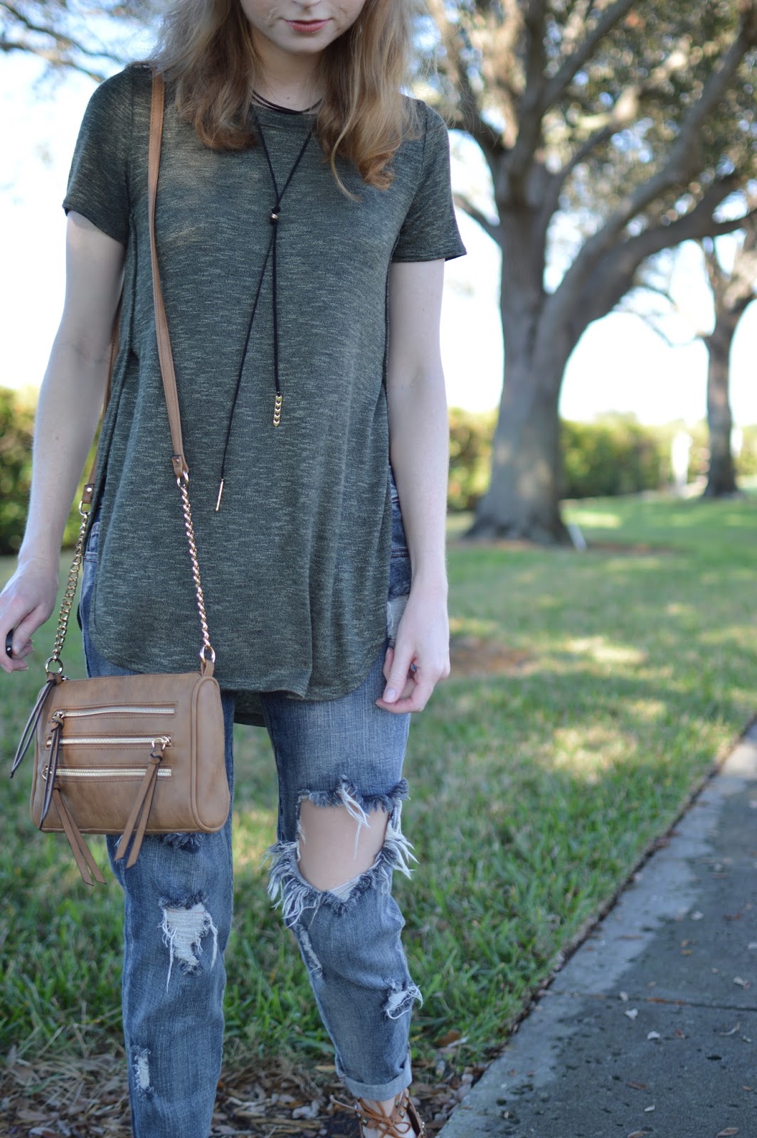 I am finally wearing this cool new bolo necklace I received for Christmas! It’s from Nordstrom and is under $10 which makes it super affordable. I think it fits well with long tops, such as this green tunic I have on in this outfit. Wearing some ripped jeans completes this look. I am obsessed with my new purse because I need some more brown bags in my life! I seem to only ever buy black purses…but this one is perfect for looks with my brown sandals.