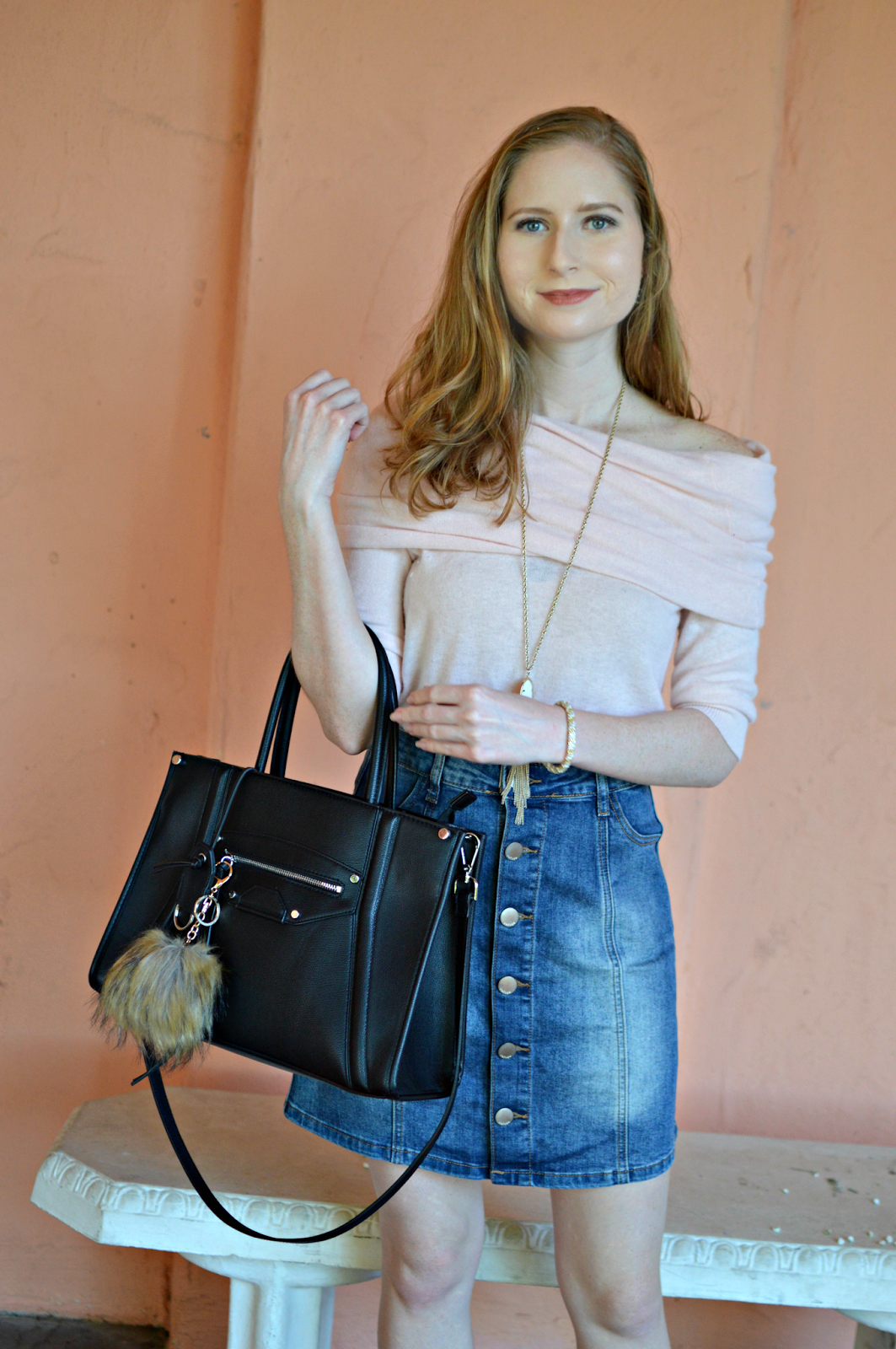 I’ve recently started to wear more pink. I’m someone who likes to stick to gray and navy but I’m switching things up a bit with this outfit look. I found this cozy off-the-shoulder sweater while out thrifting, but I linked some more options throughout this post, such as this gorgeous Free People number. I also had to wear it with my favorite denim skirt. My lovely Kendra Scott necklace adds a bit of shine to this look, too. The white color seriously works well with any look! I’ve had it for some time now and pull it out every now and then.