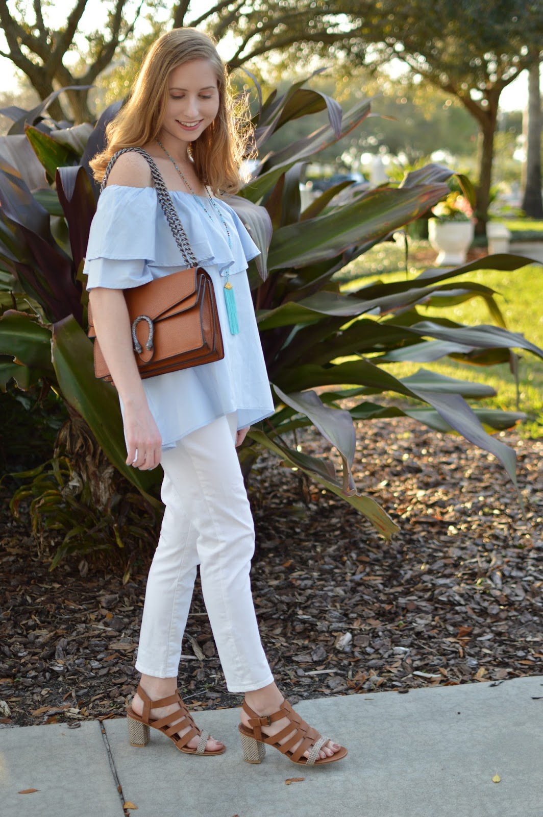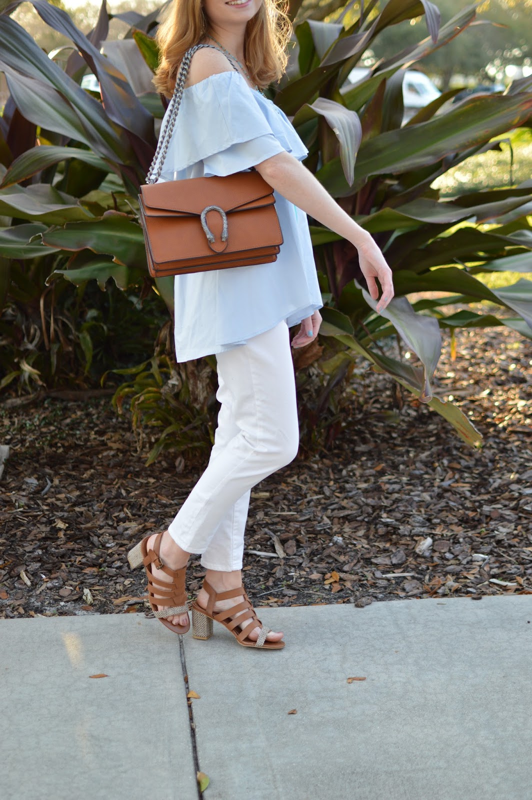 Onto this LOOK: Spring is almost here and I think these ruffle tops are going to be a big hit this season. This one I found at Ross for super cheap, and I also love THIS option and THIS option for less. These types of tops can be a little dramatic if you don’t tone it down so I paired it with some white jeggings (on sale, too!). Of course I had to add some accessories like my newest bag and my fave chunky heels for some added height. Totally check these from Urban Outfitters out, they are less than $30..