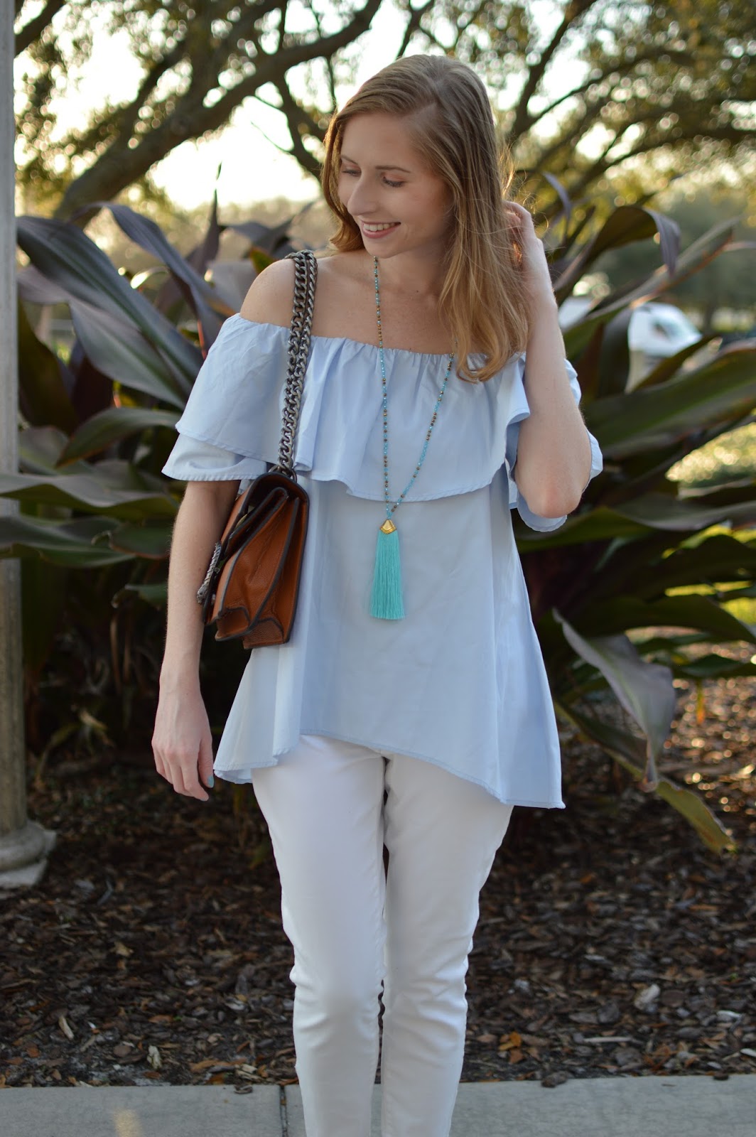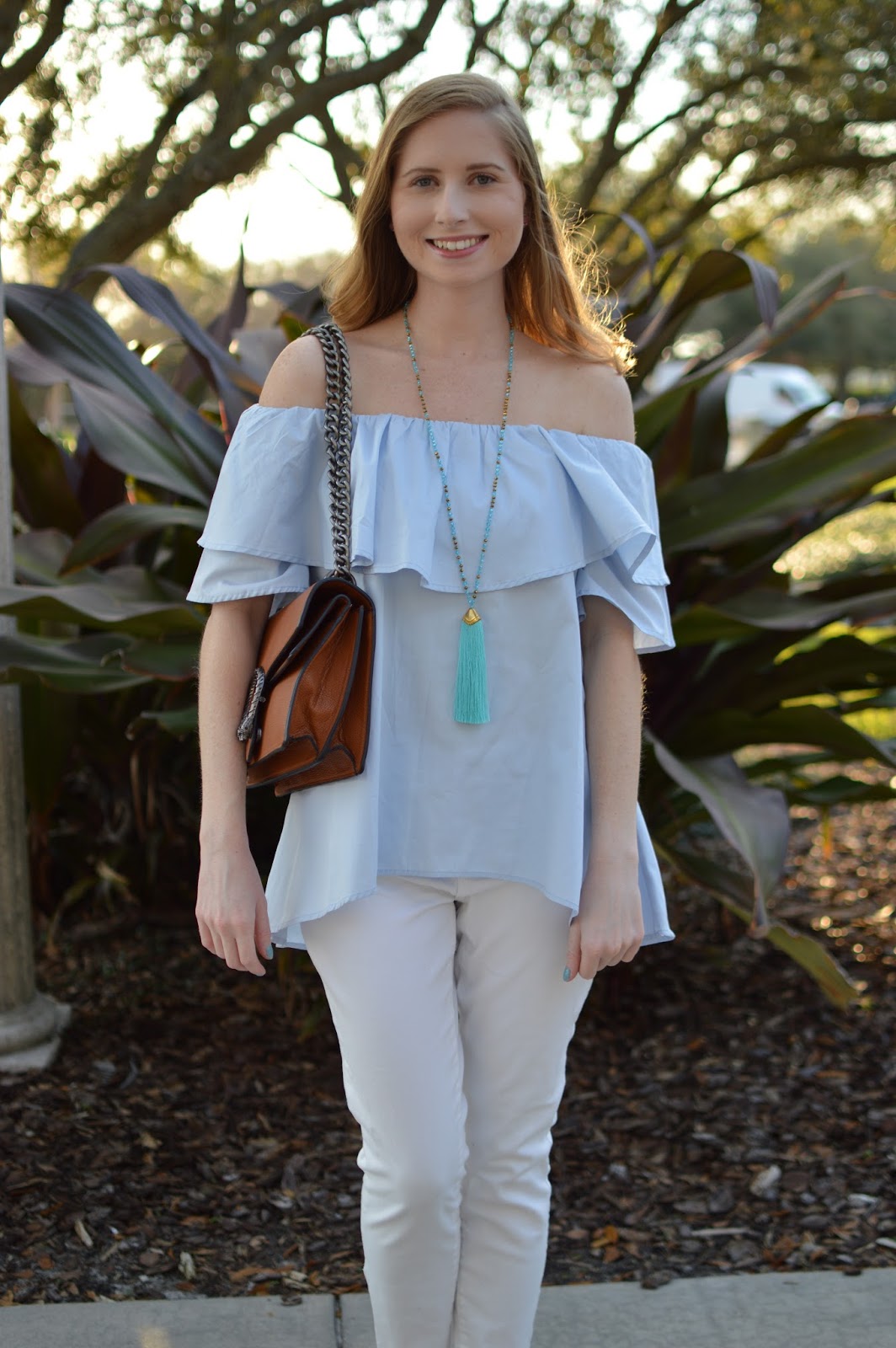 Off-the-shoulder Top + White Jeans