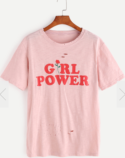 GIRL POWER!! I absolutely love this t-shirt not only because of it’s appropriate message, but for it’s cuteness that is combined with delicate tears all over. I consider this t-shirt a WIN, too. The material is polyester but it’s not too itchy. The shirt also looks exactly like the picture, so I appreciate that factor when ordering online!