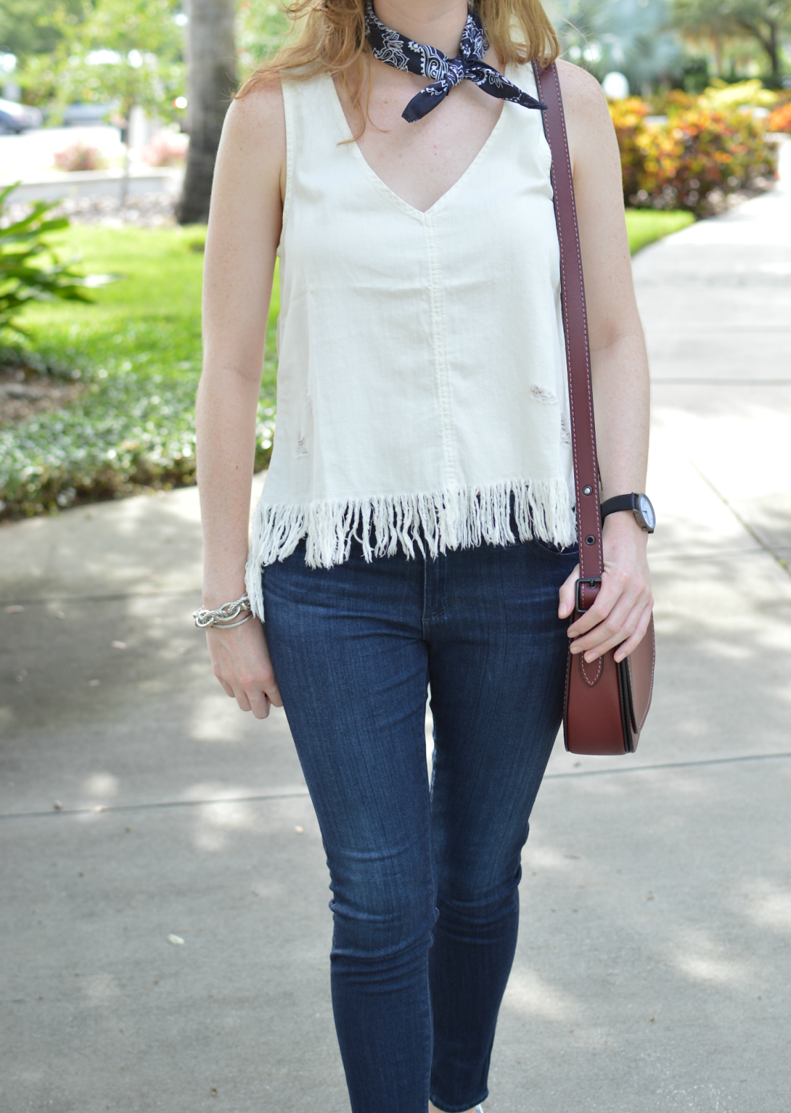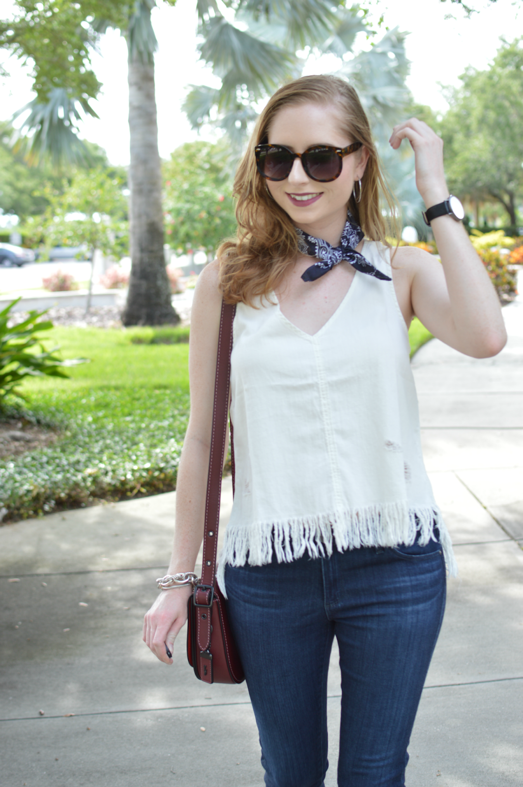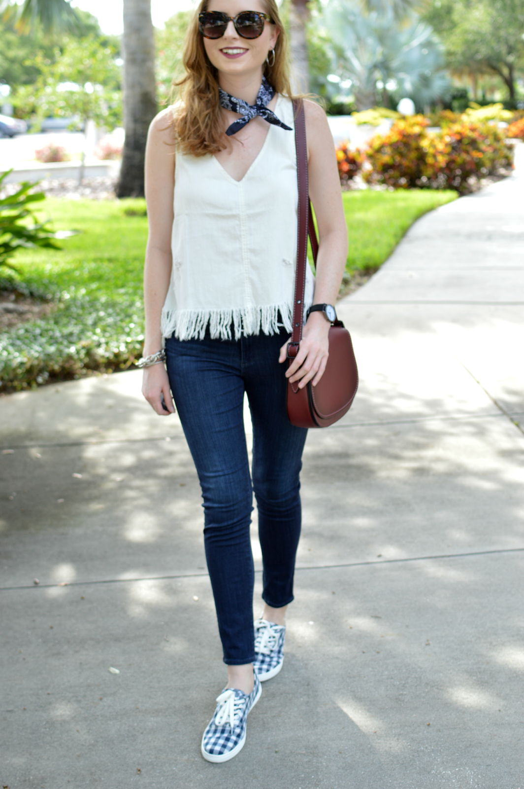 TOP: American Eagle Fringe Tank Top (old, SIMILAR HERE for $11.88) // JEANS: AG The Legging Jeans (from Nordstrom Rack for $55!) // BAG: Coach Saddle Bag // BANDANA: BP Bandana for Under $6 // WATCH: Marble Watch from Lulu’s.com for $22 / Another watch for $19 from Nordstrom // SHOES: Target Canvas Sneakers in Gingham, on SALE for $12