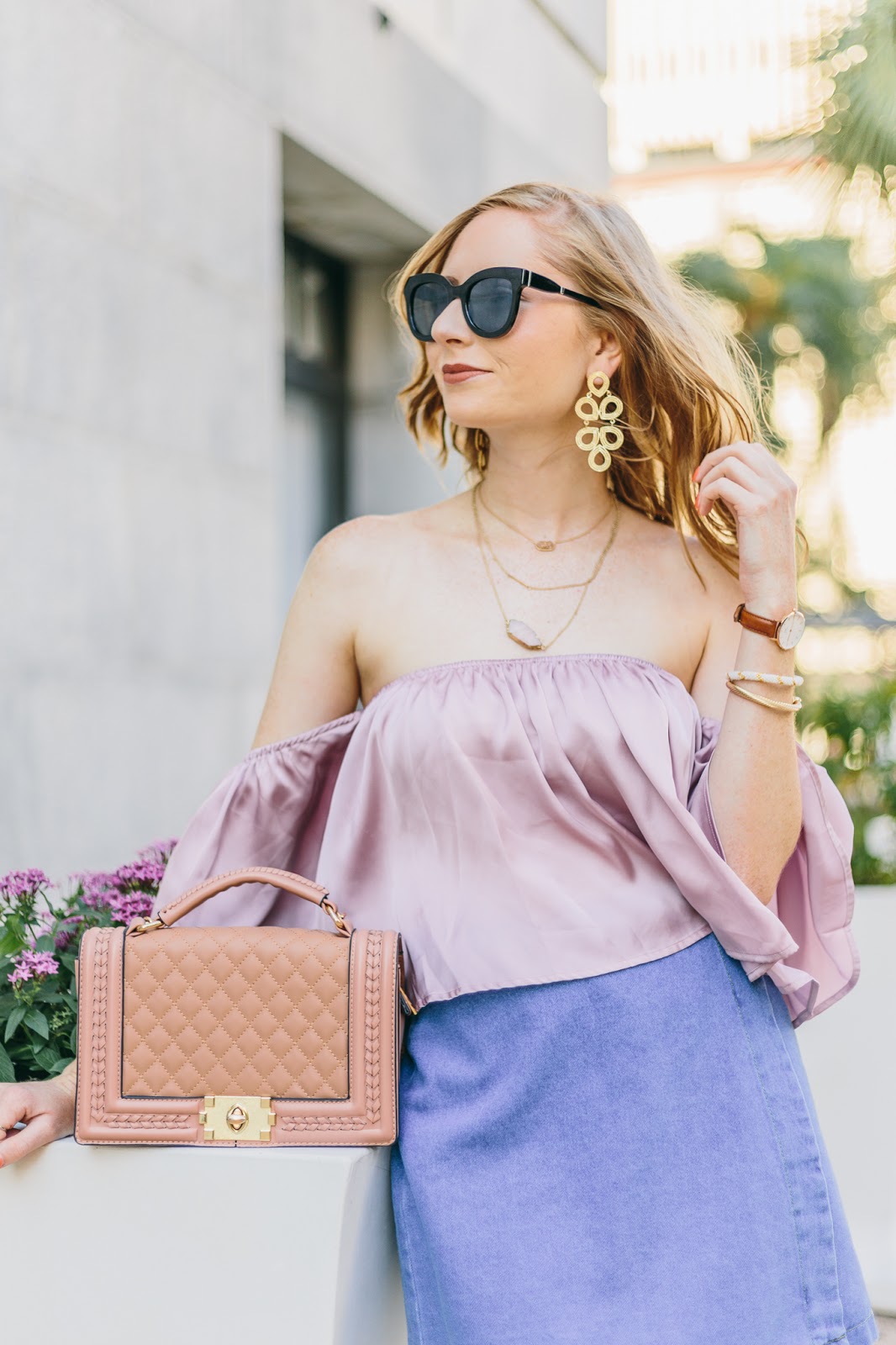 Paired with a light wash DENIM SKIRT, this look is a combination of girly and trendy all wrapped into one easy to wear outfit. Of course, I needed to add some gorgeous gold accessories like my Lisi Lerch earrings, Daniel Wellington Watch, and staple Kendra Scott Druzy Pendant.