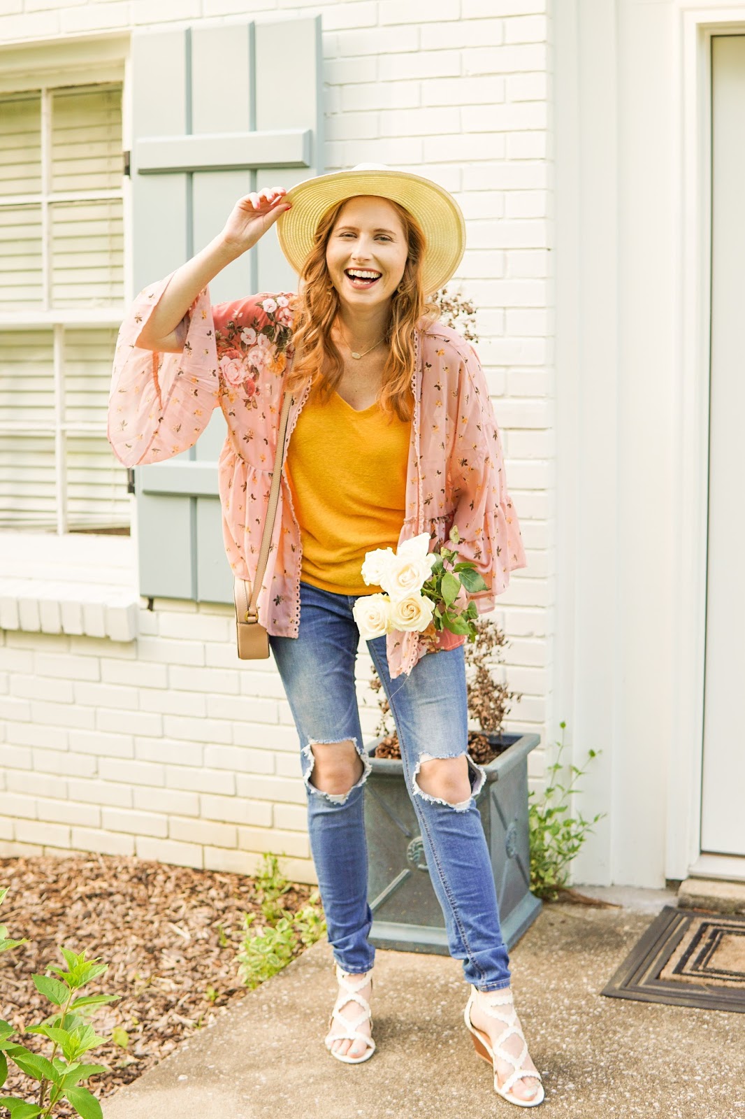 TANK TOP: Target Women’s Cross Back Tank Top – Universal Thread – Gold Size XS || KIMONO: Target Women’s Floral Print Bell Sleeve Kimono – Xhilaration – Size S ($22.99) || JEANS: Levi’s 721 Distressed Skinny Jeans (Size 27) || SHOES: XOXO Satisha Laser Cut Low Wedge (Under $50) || EARRINGS: Lisi Lerch Beaded Ginger Gold Earrings || NECKLACE: Kendra Scott Elsa Pendant Necklace || BAG: Tory Burch Mcgraw Camera Bag (Sand)