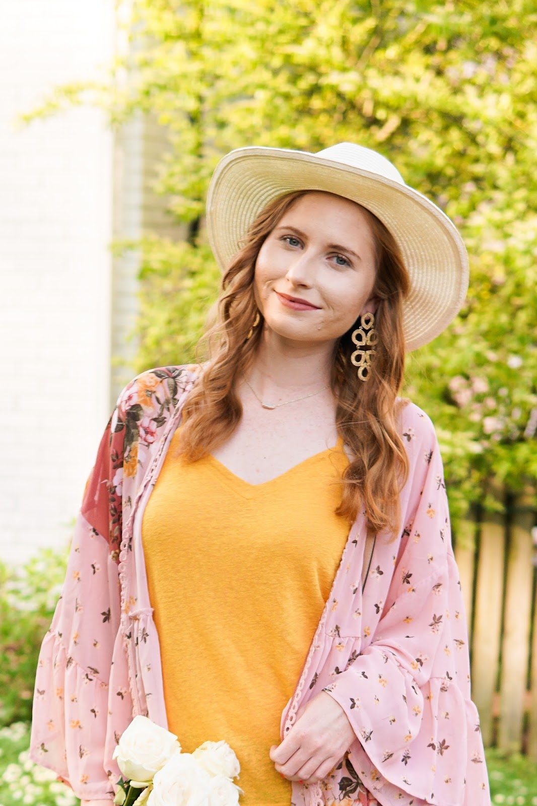 Keep reading to find out more about this entire look as I style a pretty pink kimono over a casual mustard-colored tank while on vacation in the Music City!