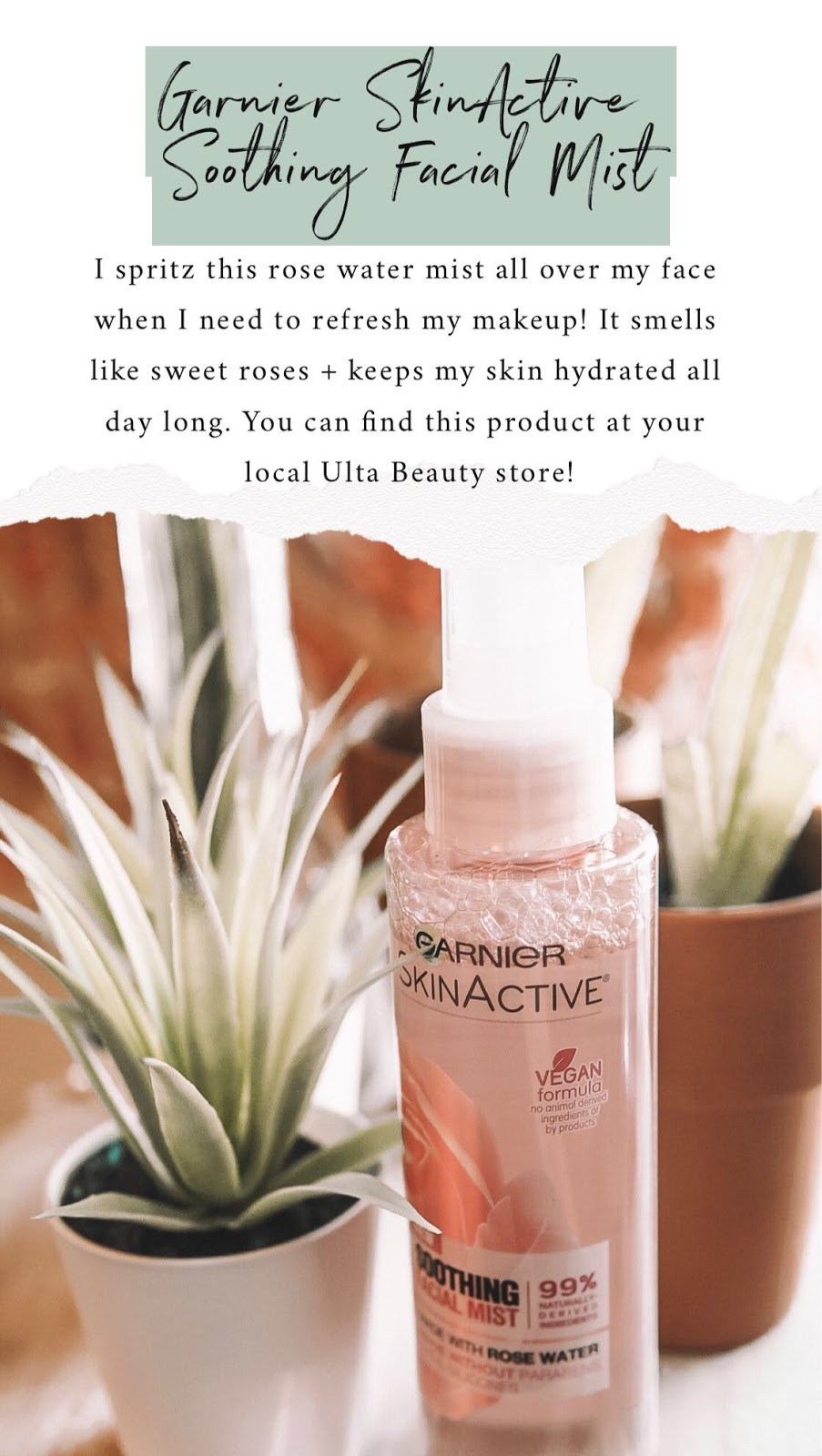 I carry it in my tote bag and find myself spraying it on my makeup every few hours for a nice refreshing punch of hydration. The mist itself has rose water and is free of parabens, dyes, and silicones!