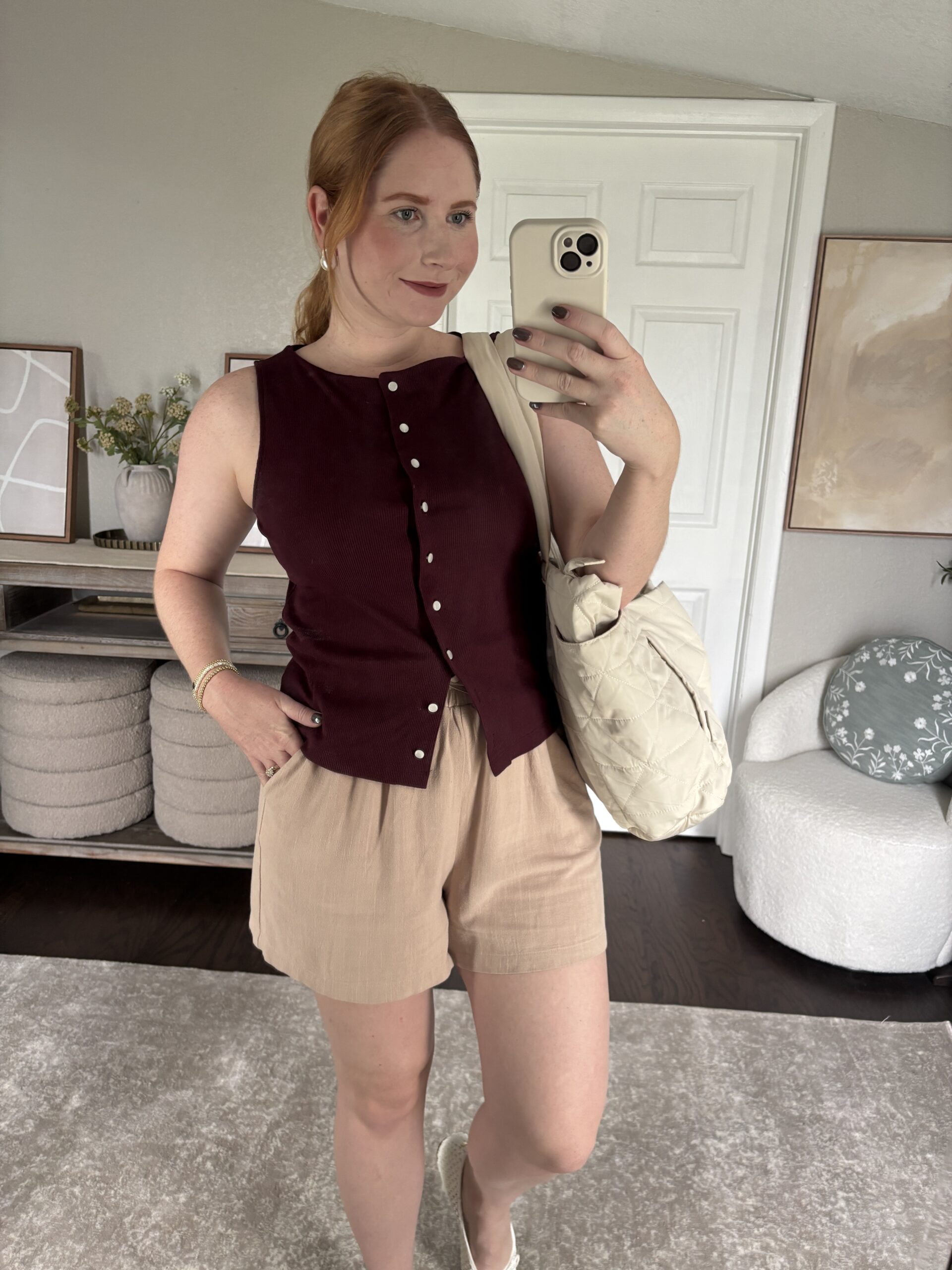 I also really enjoyed wearing more shades of red, especially burgundy, this year! Here’s a fun burgundy sleeveless tank top that ended up being such a top seller. I wore it casually with linen shorts and dressed up with a pair of neutral trousers.