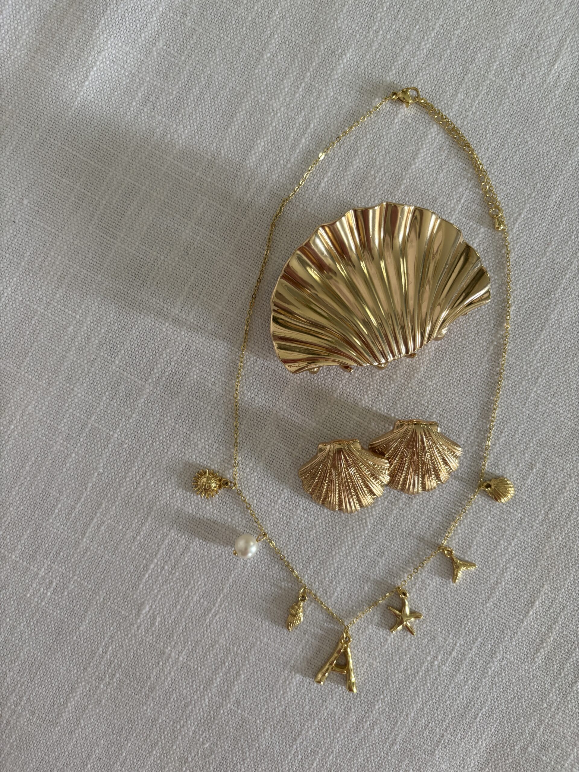I wore this initial necklace, seashell earrings, and seashell hair clip a lot during the summer season. Shop these seashell accessories here.
