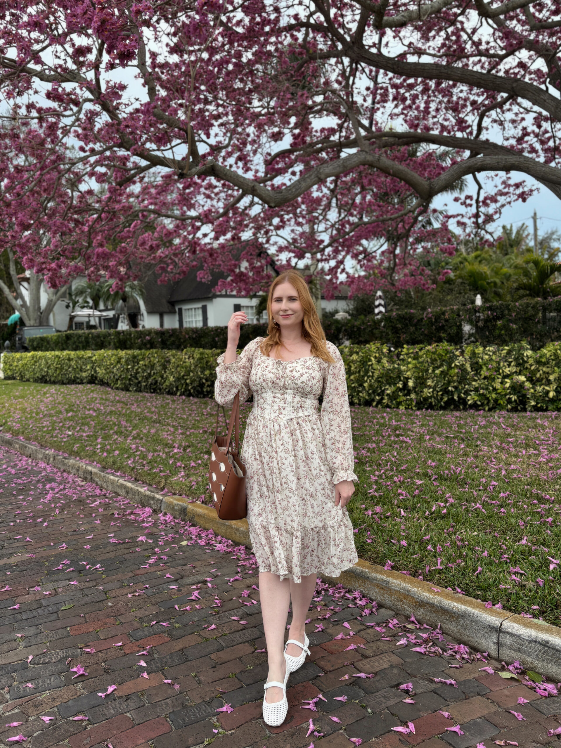 Found this trendy neutral floral long sleeve dress (now marked down to $18.55) while browsing the racks at Walmart! Had to style it for a reason trip to the infamous pink tree here in St. Pete. The silhouette to this romantic dress reminds me of the aesthetic to the new movie Wuthering Heights.