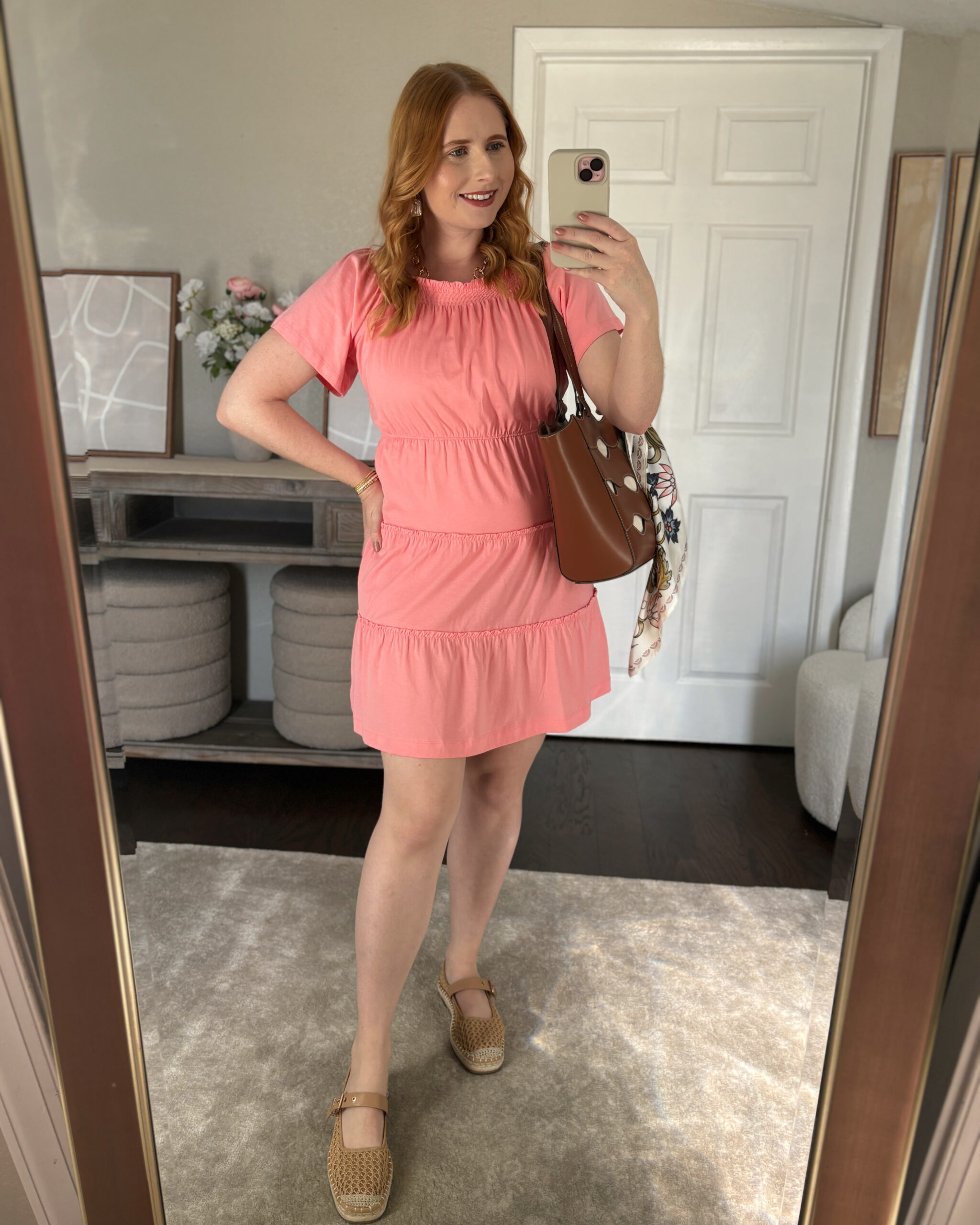 Watch this cotton mini dress fly off the shelves at your local Walmart because it’s an instant classic. I chose the coral pink tone and had so much fun accessorizing this cotton dress with my Walmart tote bag and new floral printed Target scarf (on major trend). In Florida I am constantly rotating out cotton and linen pieces to keep me feeling comfortable in the miserable heat so I know this will be one of my go-to options!